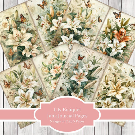 Lily Bouquet - Junk Journal Pages, Journal Paper Set, Flowers, Journal Paper, Printable Journal, Scrapbook Paper, Digital Paper