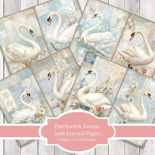 Patchwork Swans - Junk Journal Pages, Journal Paper Set, Birds, Journal Paper, Printable Journal, Scrapbook Paper, Digital Paper