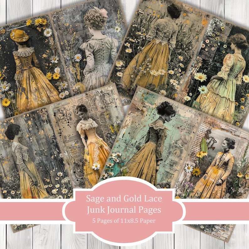 Sage and Gold Lace - Journal Paper Set, Junk Journal Pages, Flower, Journal Paper, Printable Journal, Scrapbook Paper, Digital Paper